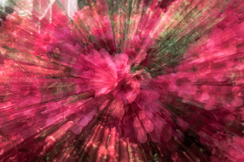 The pinks are azaleas at sunset -- one moving slow one fast. The multi-colored shot are of the sun filtered through a red maple with trees in the background -- again one slow and one fast.